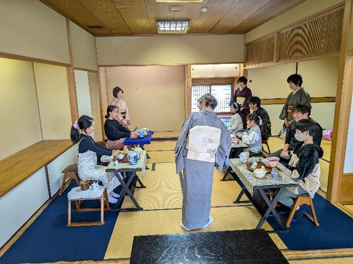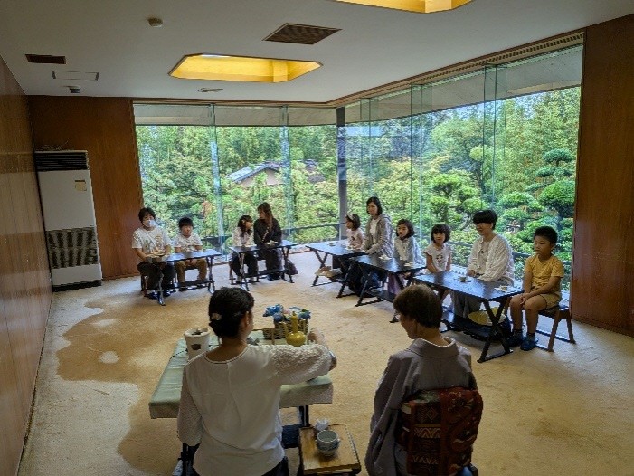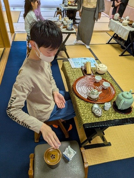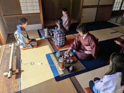 八幡市の歴史文化と煎茶道を含む茶道とのつながりを学んだ後、煎茶の心をじっくりと体験します。その後、普段あまりふれることのない煎茶の香りを体験したり、茶室の入り方を学びました。初めてのお茶室にドキドキですが、実際に体験して、身体を動かす中で、少しずつ緊張もほぐれていったようでした。