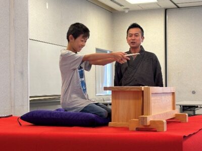 高座に上がる、下がる所作を再確認しました。楽しくワークショップに参加できる環境を整えることと、講談を通じての学びを得ることのメリハリを講師が教えます。