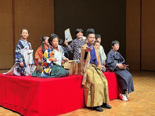 子どもたちは、自身の担当の話を高座で堂々と披露しました。その姿に、子どもたちの家族や友人、そして南龍師匠も聞き入っている様子でした。