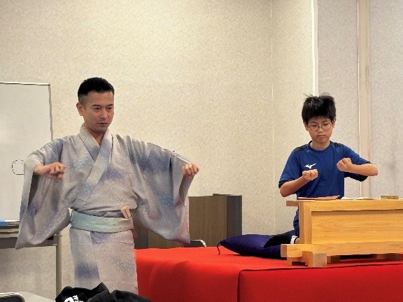 高座に上がる、下がる所作を再確認しました。楽しくワークショップに参加できる環境を整えることと、講談を通じての学びを得ることのメリハリを講師が教えます。